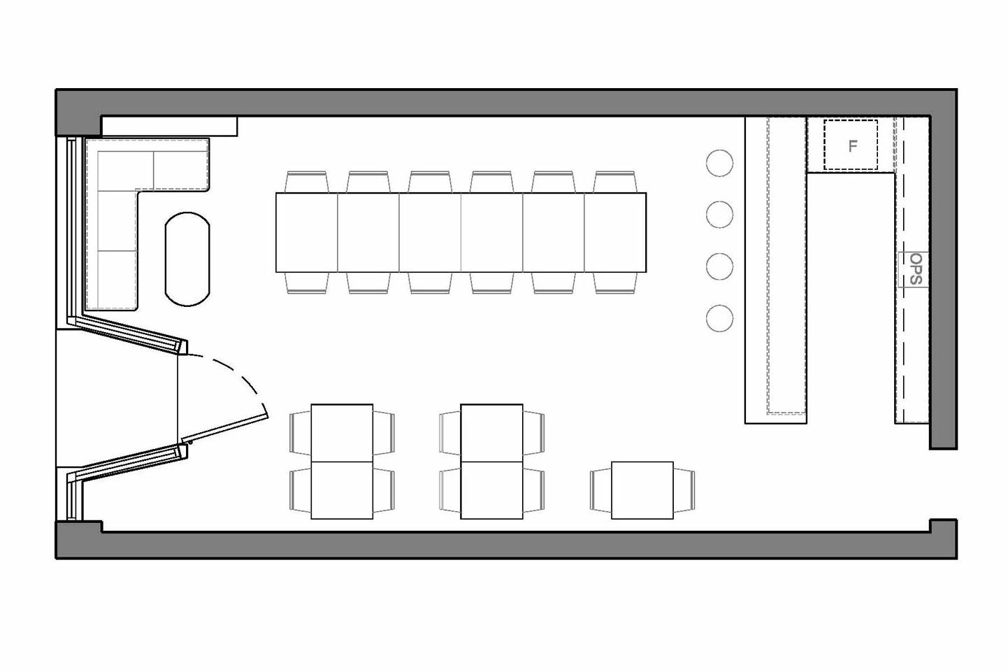Interior and furniture design according to the restaurant’s raw vegan philosophy. The green wall behind the bar creates a focal point which resonates with the leafy outdoors, while the black iron hardwood furniture evokes raw and warm textures.
